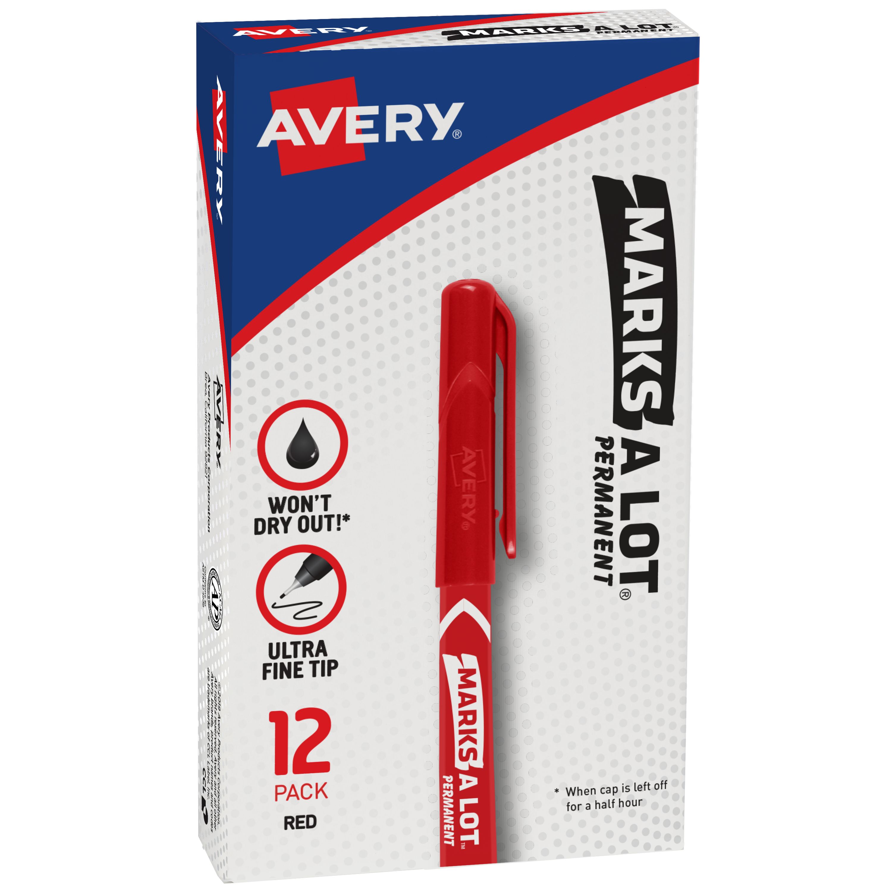 For projects that require precision and bold writing capabilities, look no further than the Avery® Marks-A-Lot® Ultra Fine Permanent Marker. Pack contains 12 ultra fine tip red markers. Every pen stroke produces crisp lines in a rich red that can be applied to virtually any surface, including paper, glass, metal, plastic, and more. Ink output is smooth, dries quickly, and is water and rub resistant. The fine tip is durable and can be left uncapped for 30 minutes without drying out. While capable of producing strong, powerful lines, this marker maintains a low-odor profile that won’t interfere with any of your writing activities.