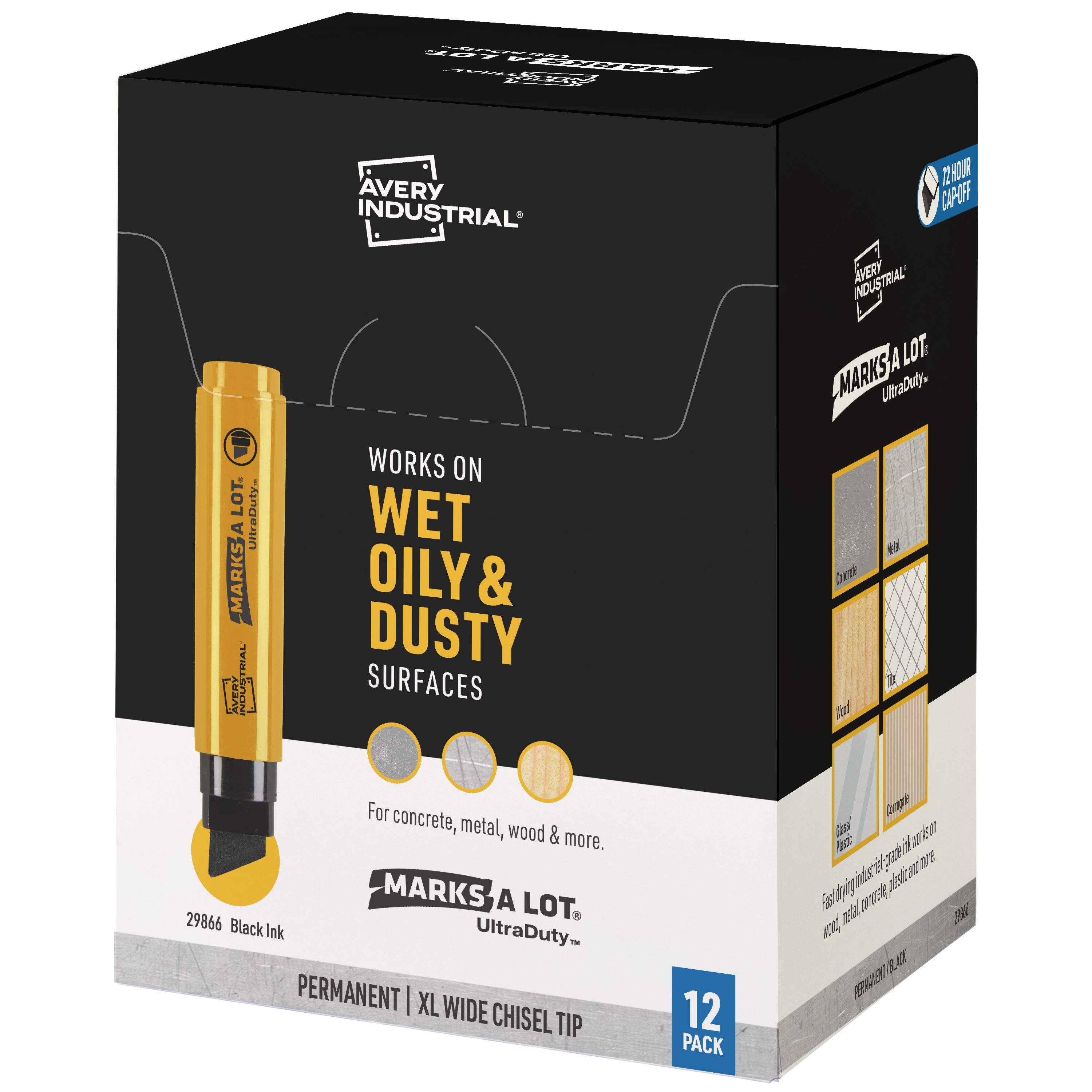 Get the job done with this 12 pack of Avery 29866 Marks A Lot UltraDuty markers with XL wide chisel tips. Built for situations where standard permanent markers just aren't enough, Avery Marks A Lot UltraDuty markers are perfect for construction sites, warehouses, workshops and more.