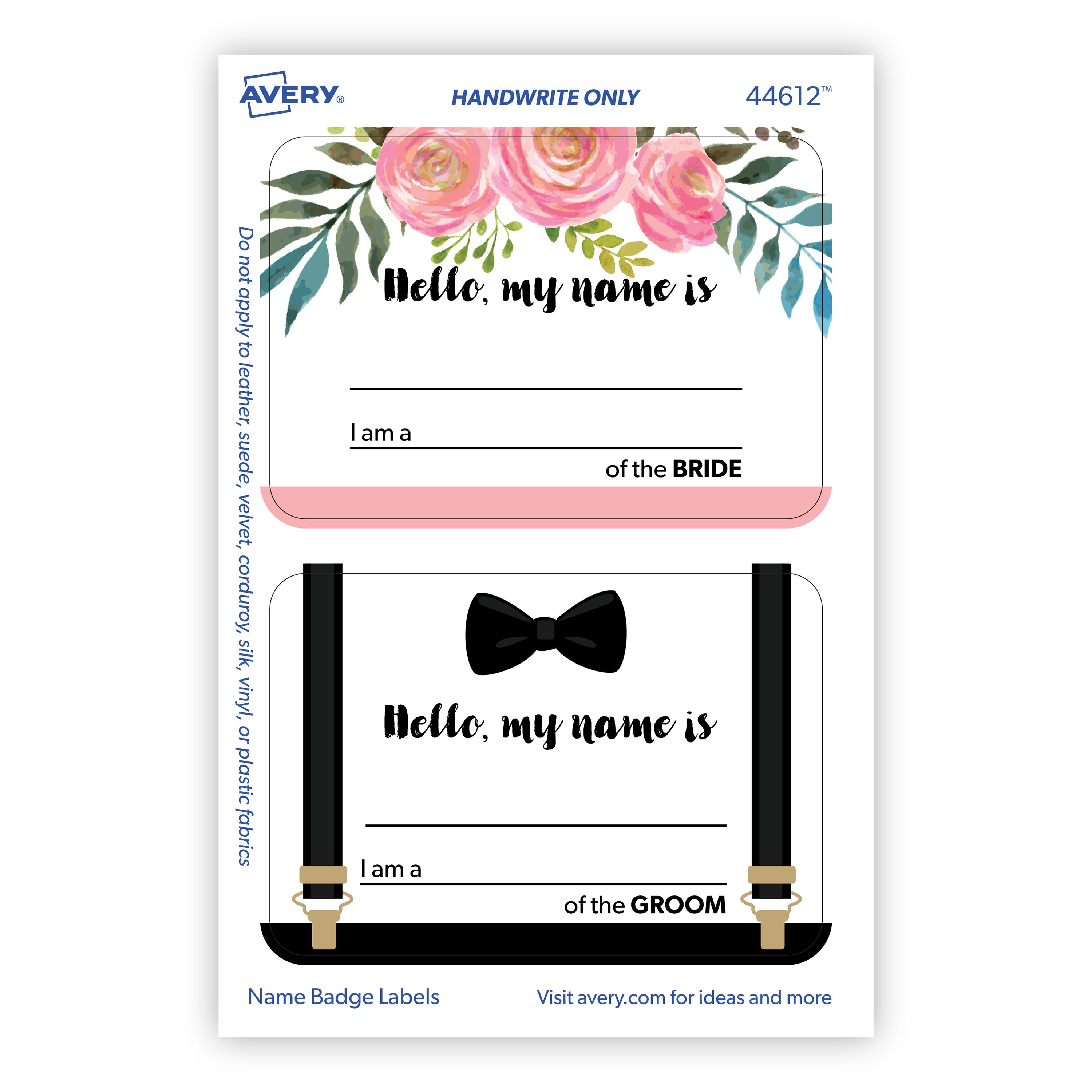 Avery® Adhesive Name Tags, Wedding Guest, Bride & Groom, 2-1/3" x 3-3/8", 36 Name Stickers (44612)