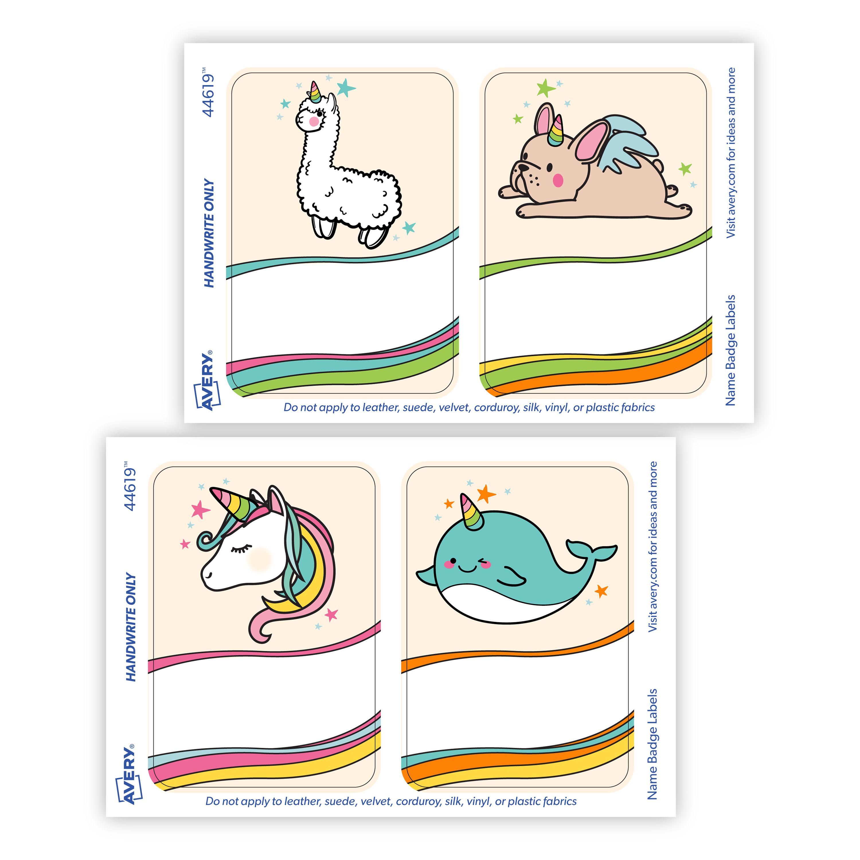 Avery® Adhesive Name Tags, Rainbow Animals, Assorted (Unicorn, French Bulldog, Llama, Narwhal) 2-1/3" x 3-3/8", 36 Vertical Name Stickers (44619)