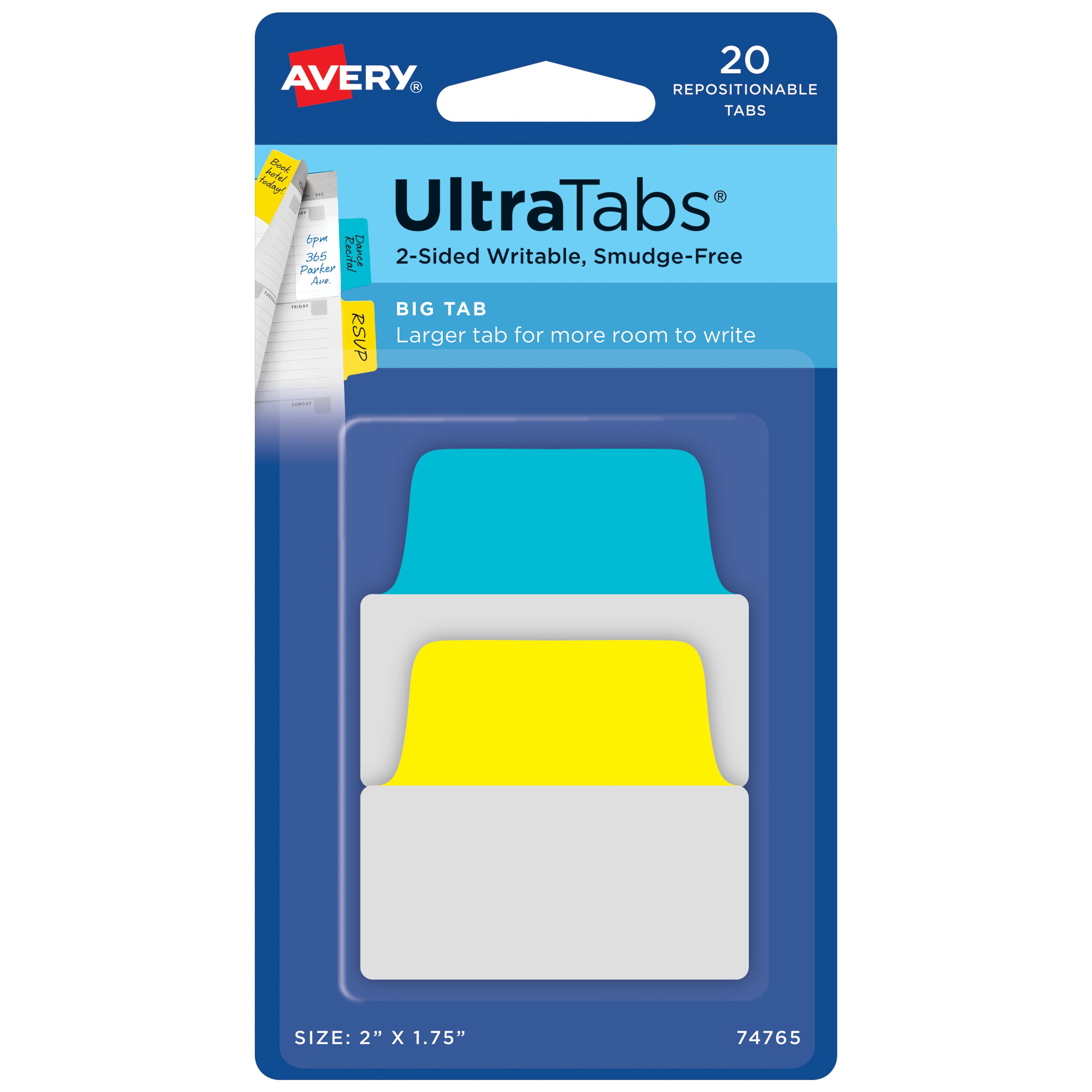 Big Ultra Tabs (74765) offer a bigger 2” x 1.75” tab for more text or larger writing to make indexing, marking and referencing documents quick and easy. These yellow and blue sturdy tabs are writable on both sides and the clear adhesive body does not interfere with any text or graphics underneath. Get crisp and clear writing on the smudge free* page tabs with most pens, pencils, markers and highlighters. These durable, repositionable tabs can stick securely to any page, yet removes easily for multiple uses. Perfect for home organization; use these sticky tabs as page flags in magazines, bible tabs for passages or recipe index tabs in cookbooks. Students, teachers and administrators will find it easy to highlight textbooks and notes without marking the pages. At the office, make quick and easy sticky notes in your weekly or monthly planner and mark items in a report or presentation for referencing, follow up or signatures. The pack of 20 color tabs includes 10 blue and 10 yellow tabs.