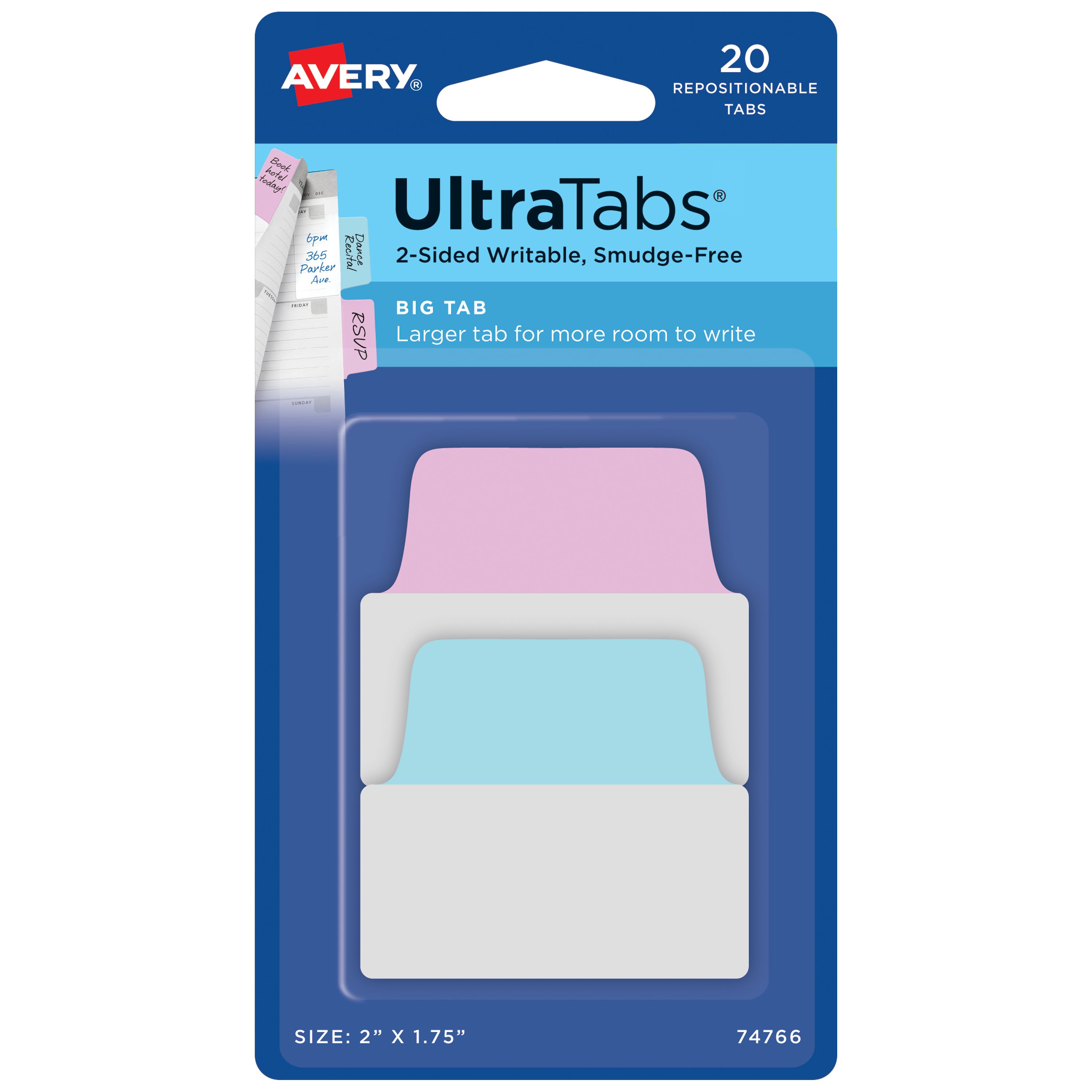 Big Ultra Tabs (74766) offer a bigger 2” x 1.75” tab for more text or larger writing to make indexing, marking and referencing documents quick and easy. These pastel blue and pink sturdy tabs are writable on both sides and the clear adhesive body does not interfere with any text or graphics underneath. Get crisp and clear writing on the smudge free* page tabs with most pens, pencils, markers and highlighters. These durable, repositionable tabs can stick securely to any page, yet removes easily for multiple uses. Perfect for home organization; use these sticky tabs as page flags in magazines, bible tabs for passages or recipe index tabs in cookbooks. Students, teachers and administrators will find it easy to highlight textbooks and notes without marking the pages. At the office, make quick and easy sticky notes in your weekly or monthly planner and mark items in a report or presentation for referencing, follow up or signatures. The pack of 20 pastel color tabs includes 10 blue and 10 pink tabs.