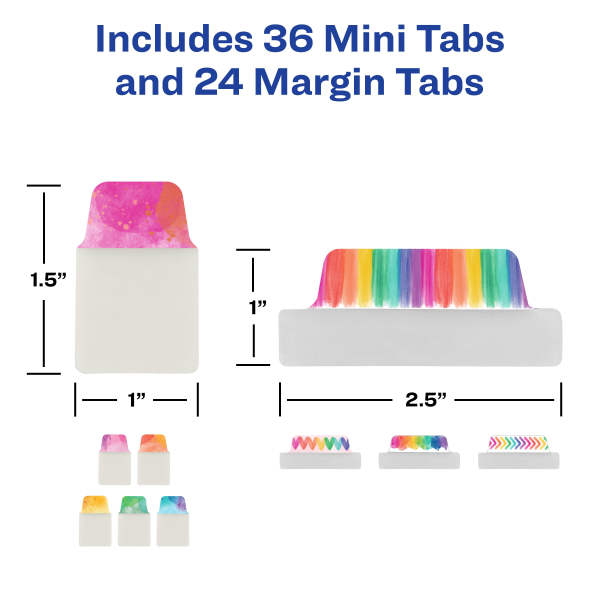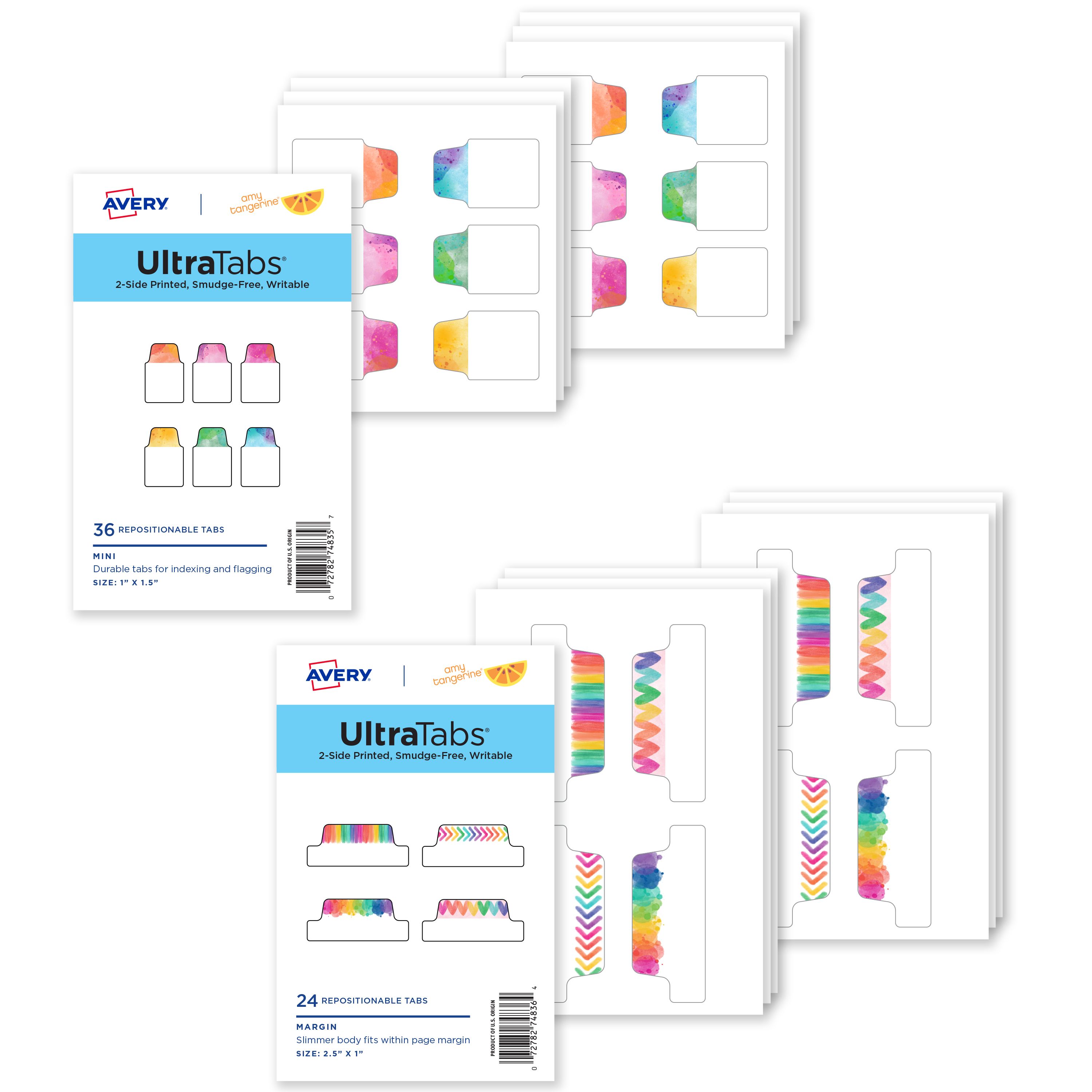 Add a splash of color to planners and notes with the Avery 74904 Ultra Tabs Bundle that includes mini watercolor planner tabs and margin watercolor sketch tabs from the Avery + Amy Tangerine Designer Collection. The mini tab design is small enough to fit planners or quickly index and flag documents. The margin tab design is sized to fit within page margins without interfering with text. The sturdy tabs are writable on the adhesive body which is clear so that you can see text underneath. Designed to be smudge-free, these page tabs are compatible with permanent markers as well as most pens, pencils, and highlighters.